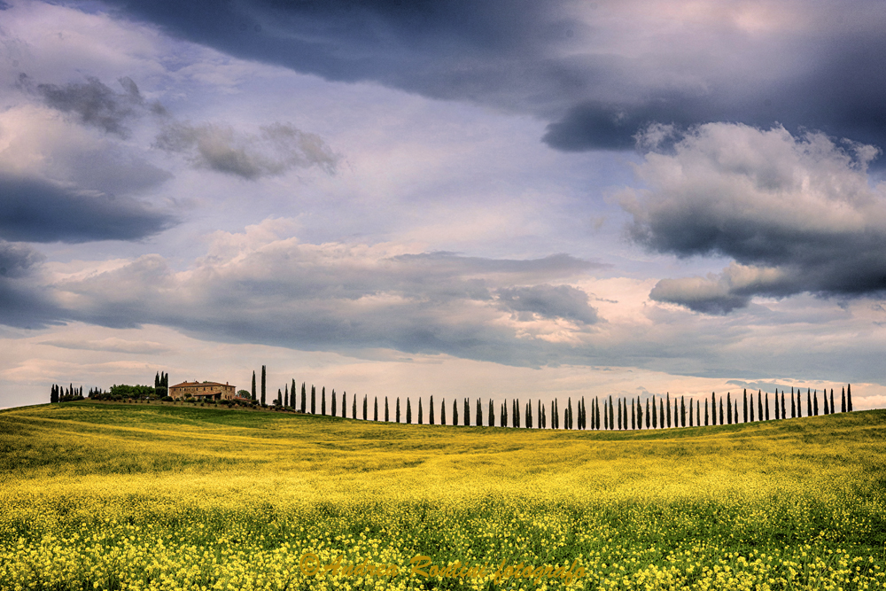 Fotografia del paesaggio toscano. Il lungo filare di cipressi tra il giallo della primavera e l’azzurro del cielo.